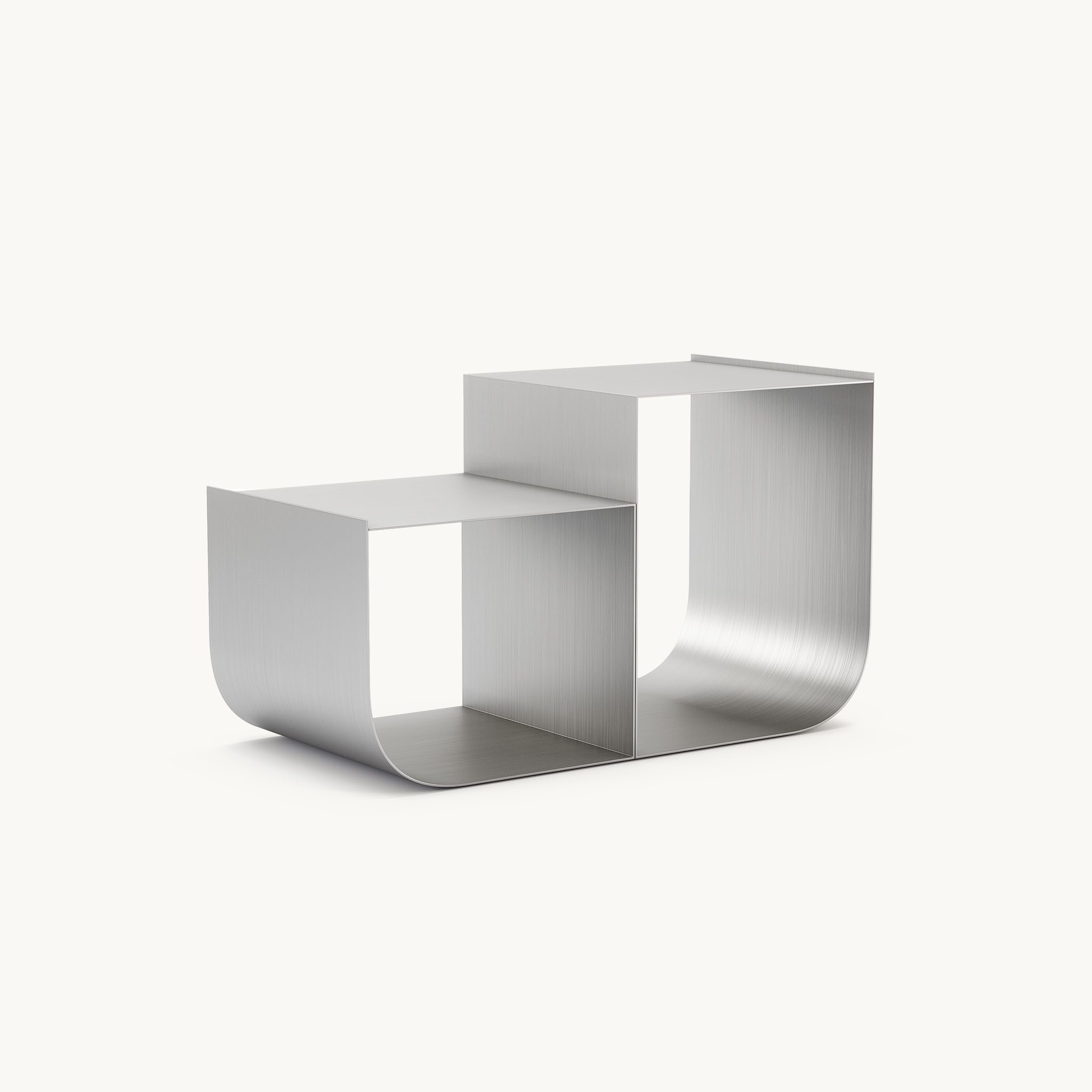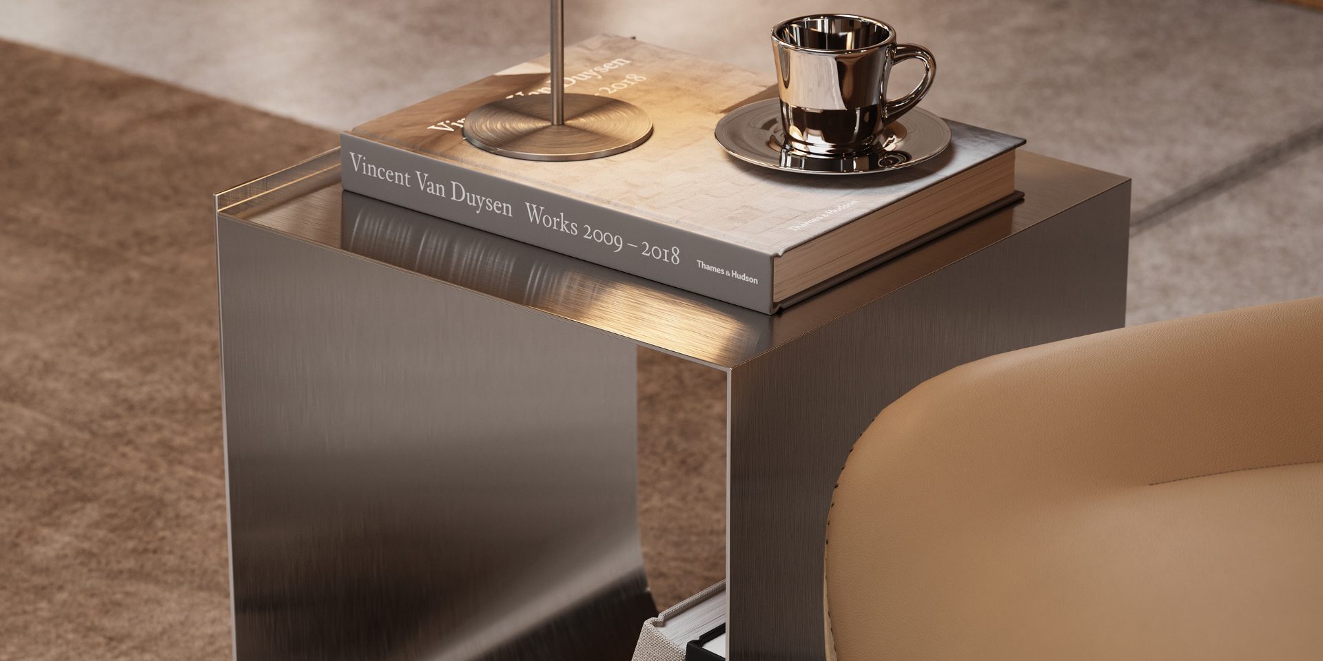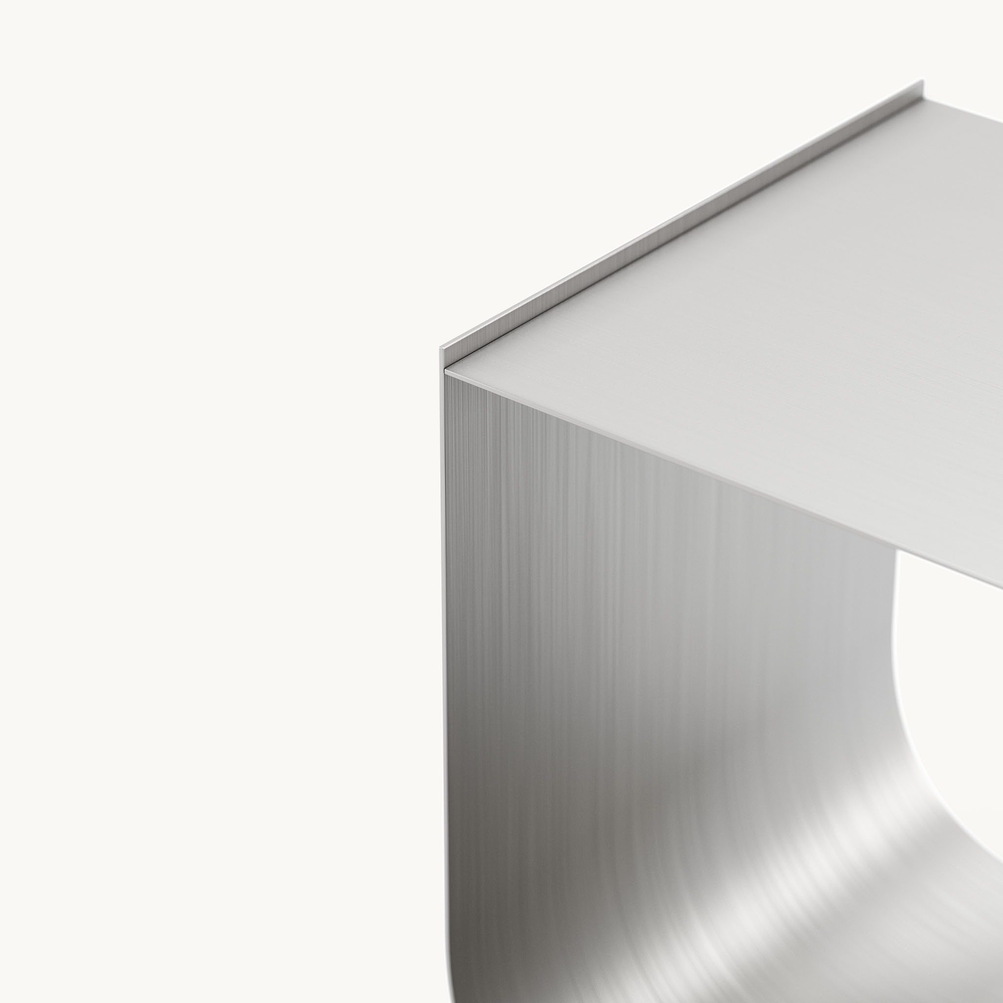 Shaped by a refined sheet metal construction, the Ren Table Set explores the contrast between pronounced curves and sharp, straight angles. This dialogue of forms gives the tables a strong architectural presence while maintaining a clean, contemporary aesthetic.