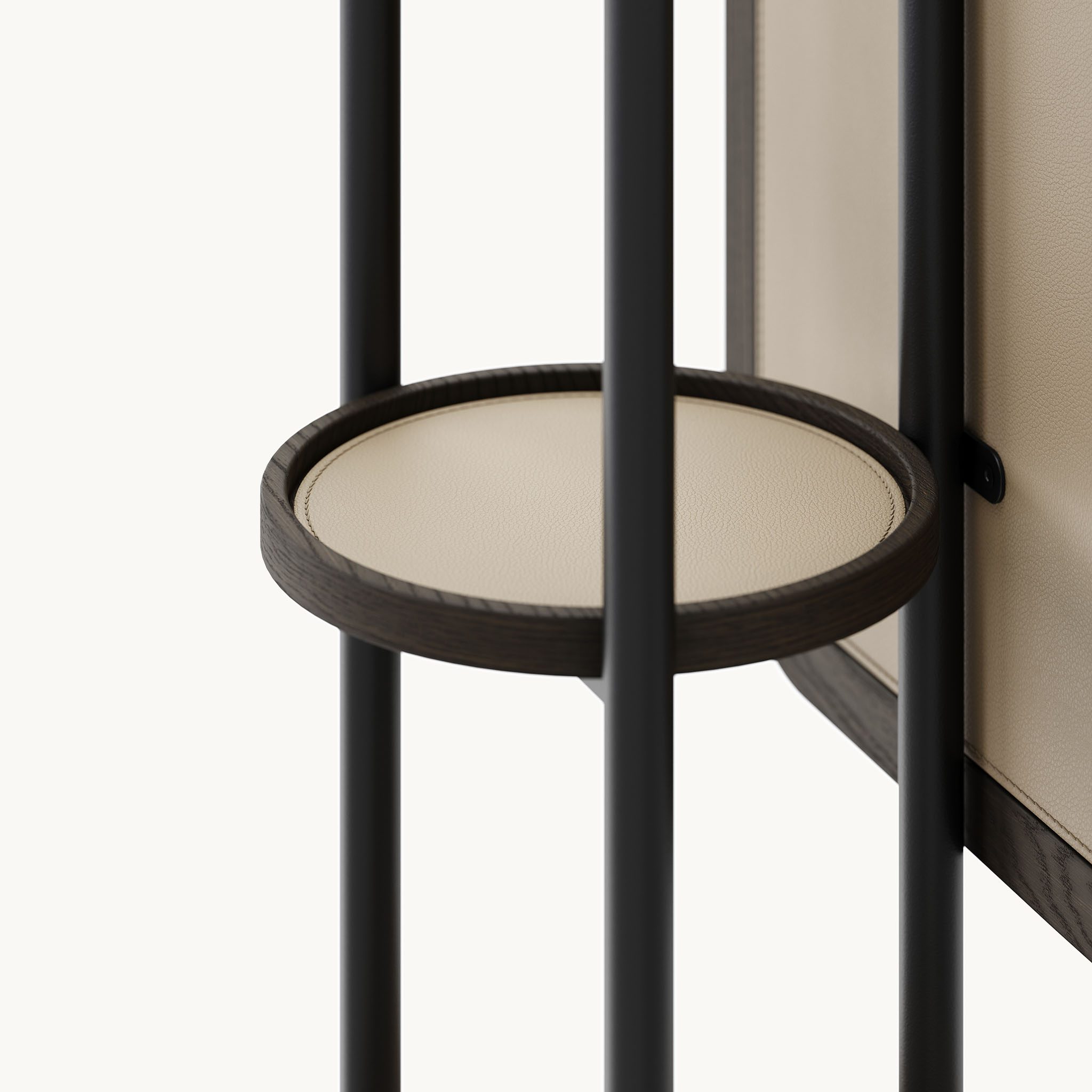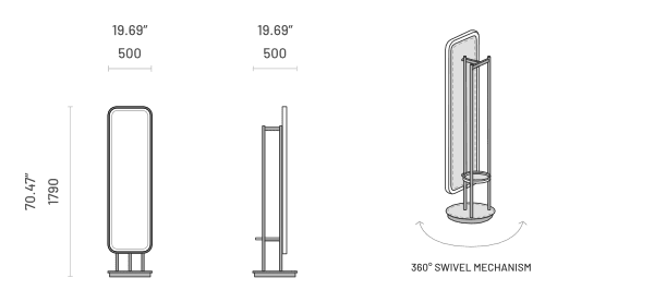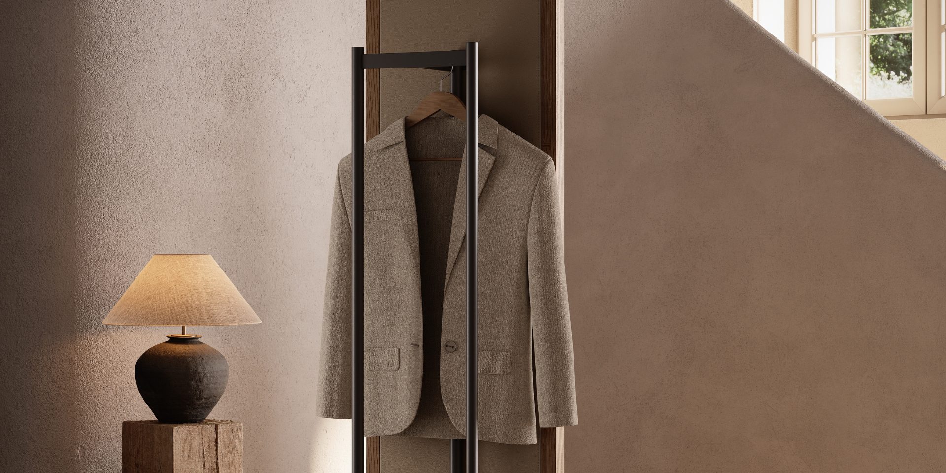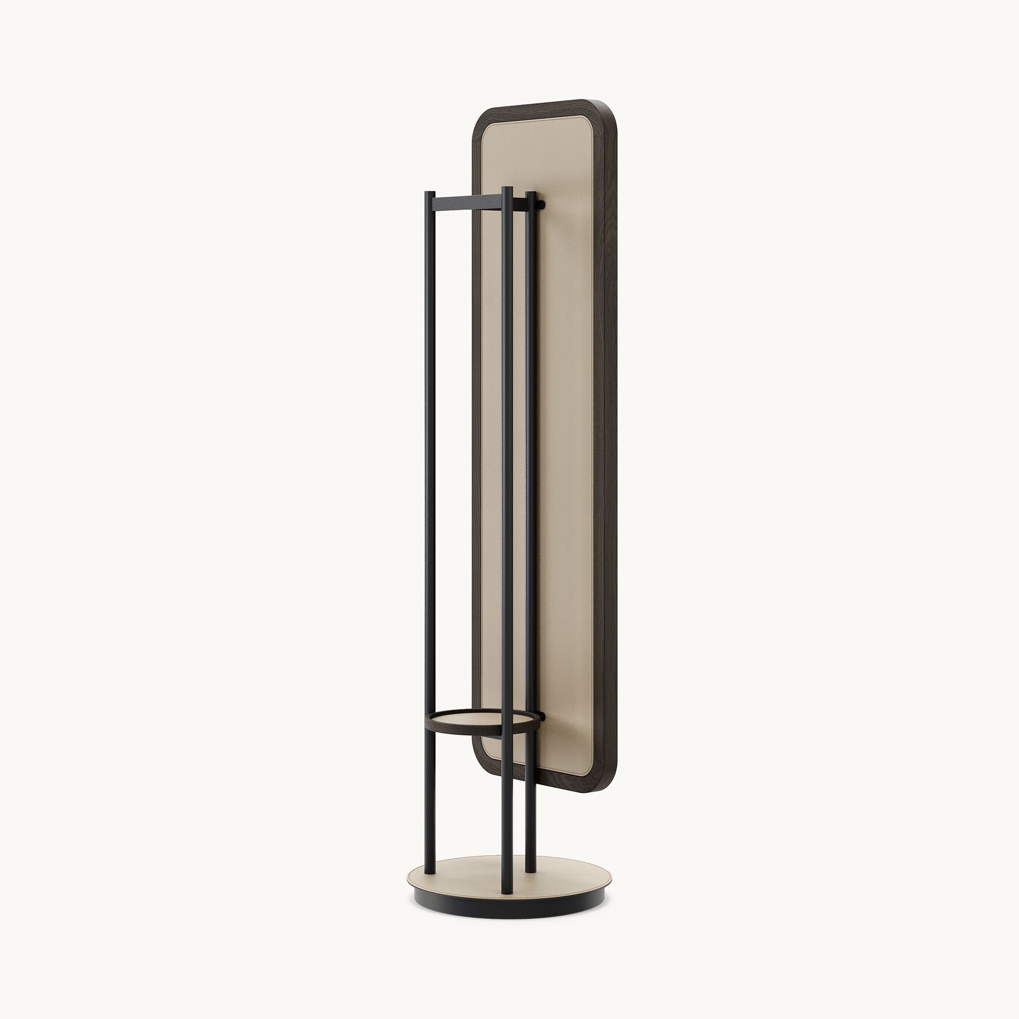 A rotation mechanism reveals a functional back with a top coat hanger, a central shelf for accessories, and a lower space for footwear, seamlessly combining clean aesthetics with everyday practicality.